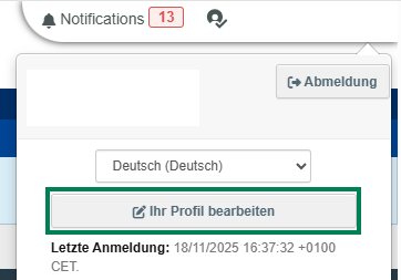 Bitte gehen Sie hierfür auf der TRACES-Homepage in die obere rechte Ecke und klicken Sie auf Ihre E-Mail-Adresse und dann auf Profil bearbeiten:
